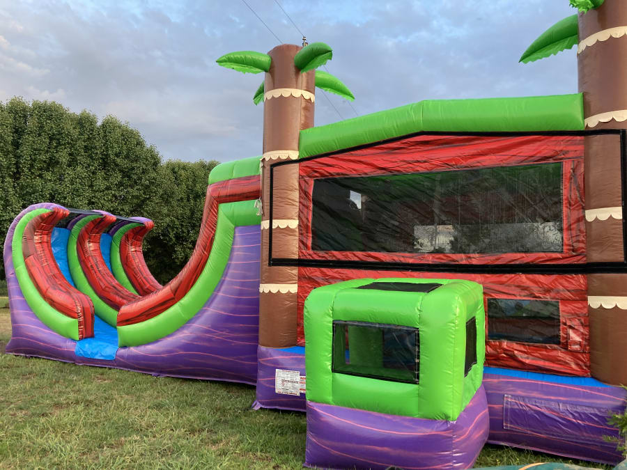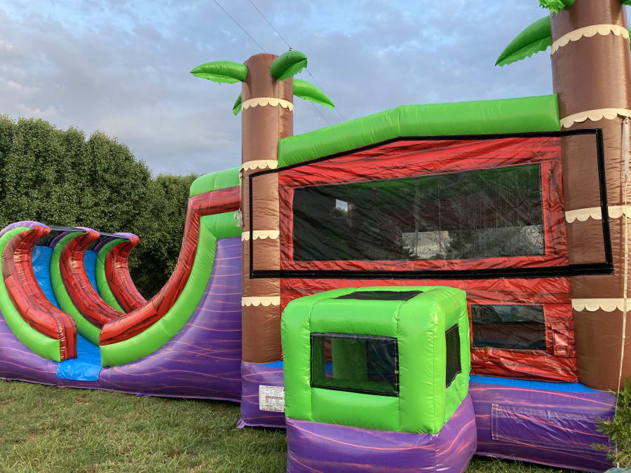 Rent this huge bounce house with basketball hoop and a dual lane water slide! It has a tropical theme, brings both a slide and bounce house for kids to enjoy the best inflatable fun. This combo also includes the ability to add a game to the side of the inflatable for even more fun for your party or event.